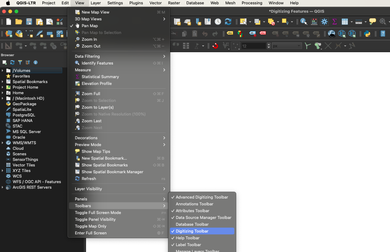 To set up QGIS for digitizing, access the Digitizing Toolbar by clicking through View (from the main menu) > Toolbars > Digitizing Toolbar. A check mark will appear next to it once it has been selected and added to your interface.
